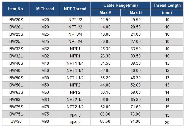BW brass cable glands are suitable for steel wire armoured (SWA) cable and aluminum wire armoured (AWA) cable, the glands provide mechanical protection for fixed installations in industrial environments. They also have an effective grounding function, provide electrical continuity via armoured wire.