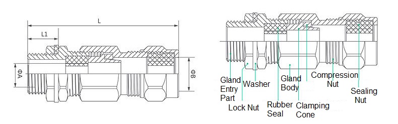 Double compression cable glands are waterproof and explosion proof, they are suitable for all types of armoured cables. The Double compressor cable glands include a sealing nut, two rubber sealings, a gland body, a compression nut, an armoured clamping cone, a gland entry part, an O ring, and a lock nut.