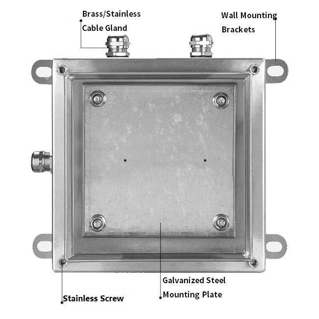 A galvanized steel mounting is supplied, so the user can drill hole on the mounting plate and install the components. 4 wall mounting brackets are supplied so user can easily mount the enclosure on the wall.