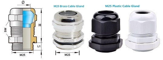 We have M25 cable gland in different materials, plastic (PA nylon, PP, PVC), brass, stainless steel 304, stainless steel 316, 316L, aluminum, etc.